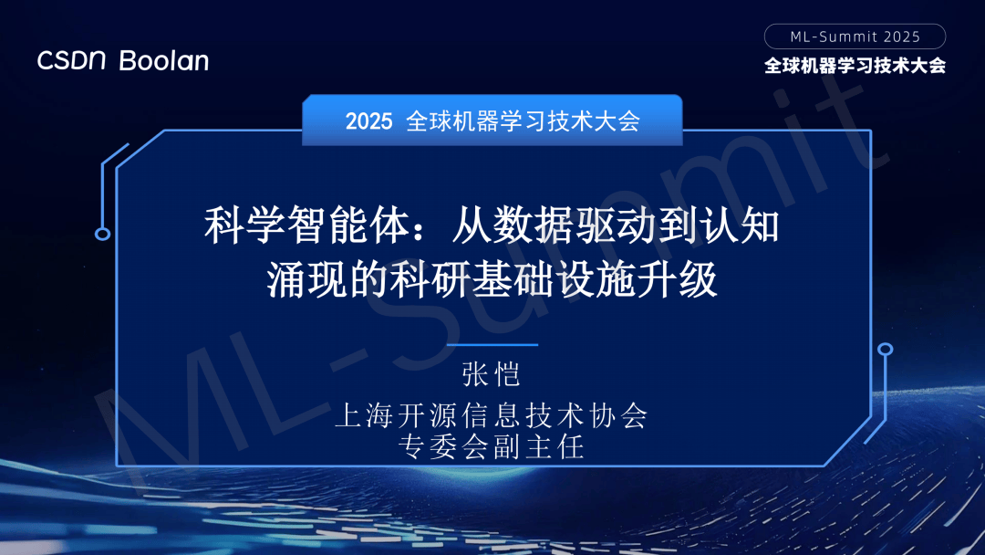 文档主要围绕ML-Summit 2025 全球机器学习技术大会(主办方为 CSDN Boolan,有 AMD X、数势科技等合作伙伴,大会含北京、杭州等地场次,如 ML-Summit 10 月 17-18 日北京、GOSIM 9 月 13-14 日杭州)展开,核心内容包括: AI Agent 相关:介绍其发展阶段(符号 Agent、反应 Agent、基于强化学习的 Agent 等)、技术框架(感知、定义、记忆、规划、行动五大模块),各模块技术突破(如多模态感知的 Google Gemini、GPT-4o,规划模块的任务分解与反思能力,行动模块的工具使用与具身智能),以及通向 AGI 的路径(模态丰富、具身智能、多 Agent 协同等),提及当前 AGI 处于 L1 阶段(代表如 ChatGPT); 应用与趋势:介绍 AI Agent 在材料研发(如智能科研平台、专家助手)等场景的应用成果,提及 2025 年 AI 应用方向(端侧 Agent、Mar-tech 等)及创投趋势(资本流向垂直领域、多智能体协同发展),预计 2025 年为 AI Agent 商业化元年,2030 年市场规模超千亿美元。