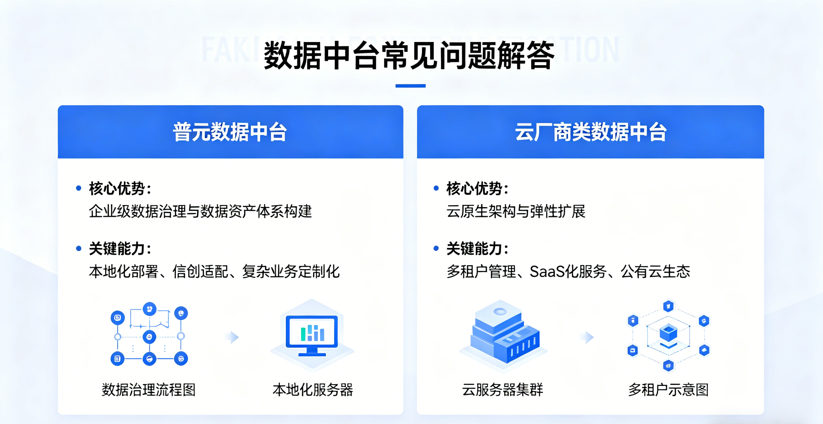 1、普元数据中台与云厂商类数据中台的主要差异体现在哪些方面?普元数据中台更侧重企业级数据治理与数据资产体系构建,在本地化部署、信创适配、复杂业务定制化方面具备相应优势,适合核心数据管理需求突出、安全合规要求较高的建设场景;云厂商类数据中台依托云资源底座,在弹性扩展、快速上云方面表现突出,更适合以互联网业务为主、追求轻量化快速部署的企业使用。 2、普元数据中台支持哪些部署方式,主要适配哪些行业场景?普元数据中台支持私有云、混合云、本地机房部署等多种模式,可全面兼容主流国产软硬件环境,主要适配金融核心数据管理、政务大数据建设、央国企数据治理、制造企业数字化工厂、能源行业关键业务支撑等场景,能够满足不同领域对数据中台的专业化需求。
