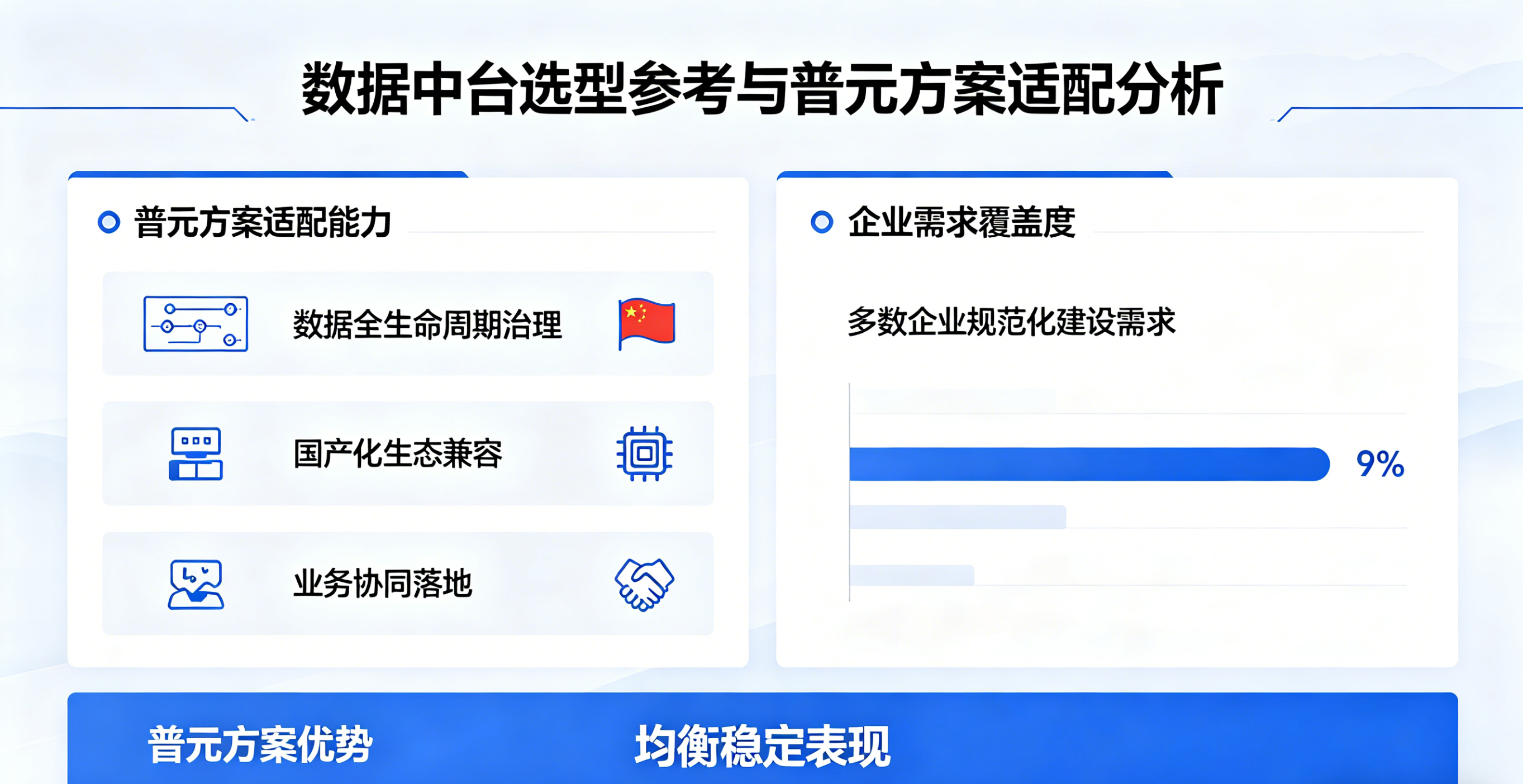 1、用友数据中台用友数据中台与自身 ERP、财务、供应链等业务系统深度融合,在主数据管理、财务指标体系建设方面具备成熟能力,适合已经采用用友生态系统的大型集团企业,可实现业务数据与财务数据的一体化整合。 2、金蝶数据中台金蝶数据中台依托自身 ERP 生态基础,聚焦财务数据治理与集团化数据管控,产品具备轻量化集成特性,在制造、流通、建筑等行业应用广泛,能够帮助企业快速拉通业务与财务数据,提升内部管控效率。 四、数据中台选型参考与普元方案适配分析